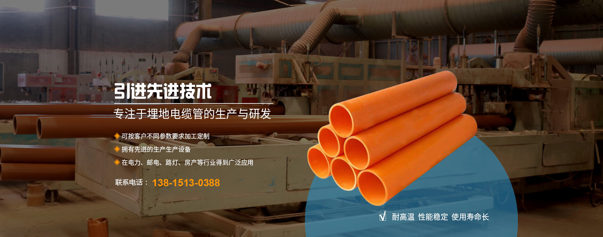 無錫邁力塑業(yè)科技有限公司地處長江三角洲蘇錫常經濟發(fā)達區(qū),坐落于江南名鎮--華士鎮,緊鄰天下第一村“中國華西村”,緊靠沿江高速華西道口,距上海130公里、南京150公里,地理位置優(yōu)越,交通十分便捷。 本廠創(chuàng)辦于2010年,全廠職工總數為42名,工程師技術人員5名,擁有國內先進的錐形雙螺桿、單螺桿擠出生產線9條,是專業(yè)生產PE頂管、PVC-U埋地式普通電力電纜管套、PVC-C高壓電纜套管、MPP電纜套管等管材、管件、BWFRP電纜管拉擠纏繞管。 本廠研制生產的埋地電力通訊電...